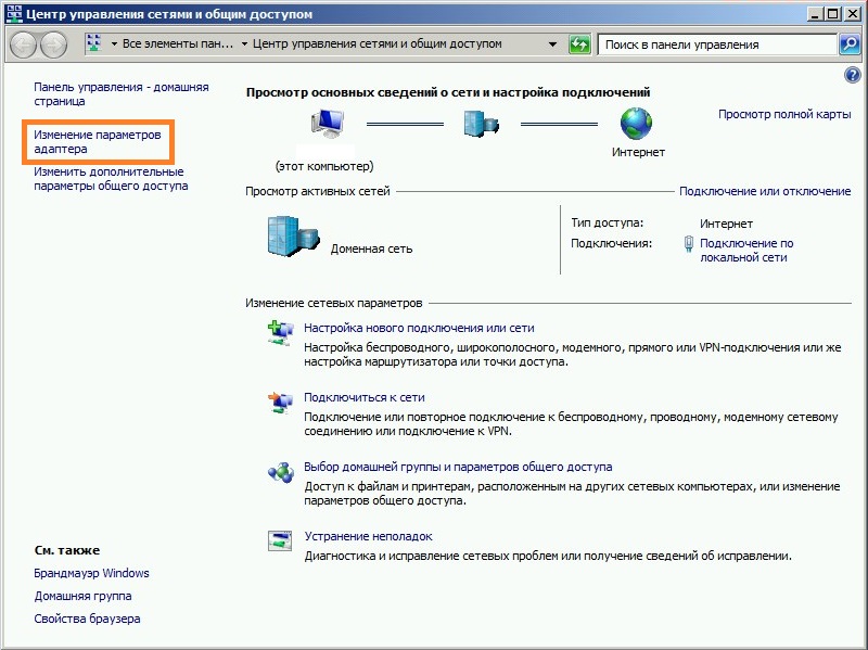 После этого, в открывшемся окне нужно выбрать пункт «Изменение параметров адаптера, расположенный в его левой части.