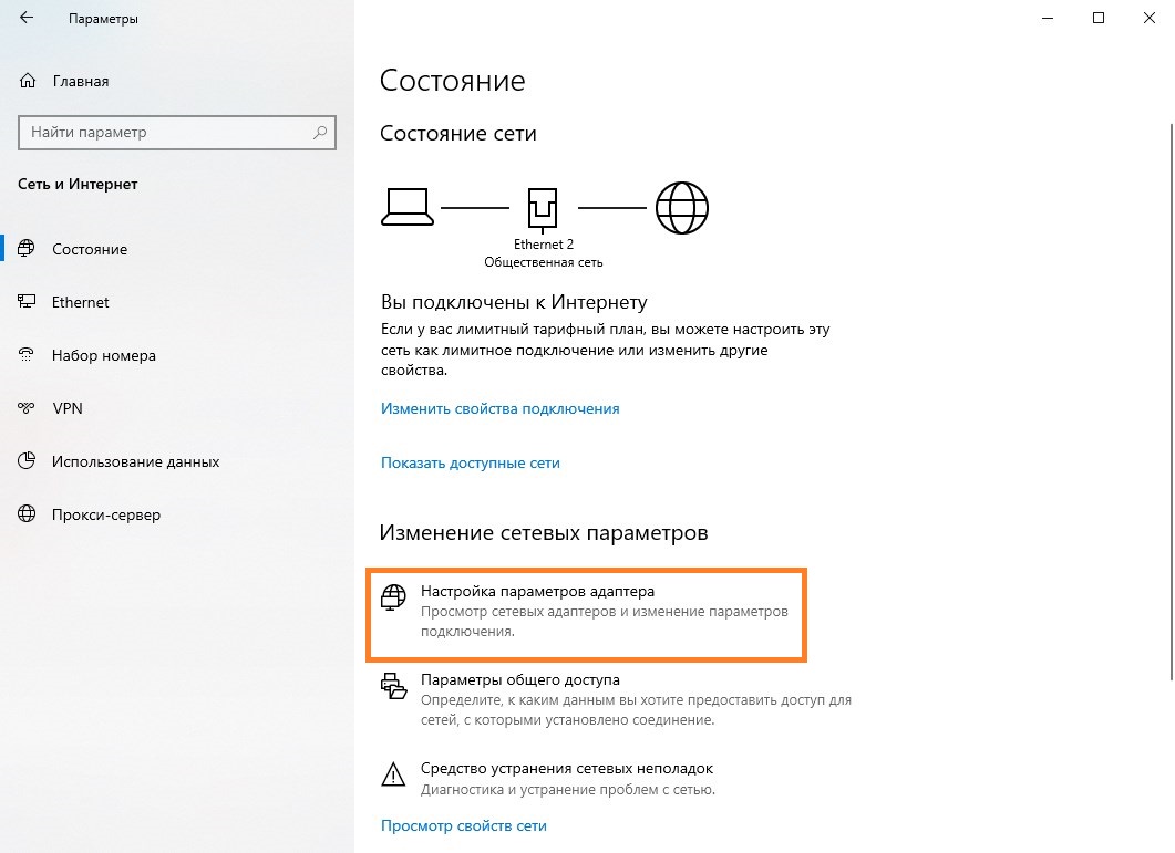 После этого, в открывшемся окне нужно выбрать пункт «Настройка параметров адаптера».