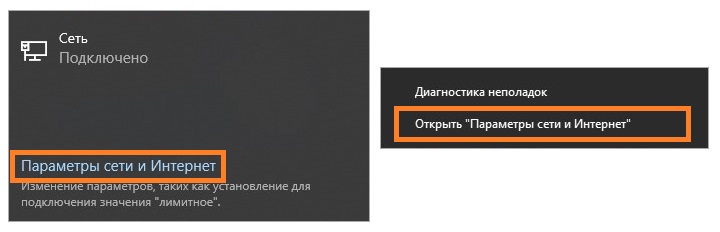 • В Windows 10 нужно щелкнуть любой кнопкой мыши по значку сети в системном трее, и в появившемся меню выбрать «Параметры сети и Интернет» или «Открыть Параметры сети и Интернет» (наличие данных пунктов зависит от того, какой кнопкой было произведено нажатие на значок сети).
