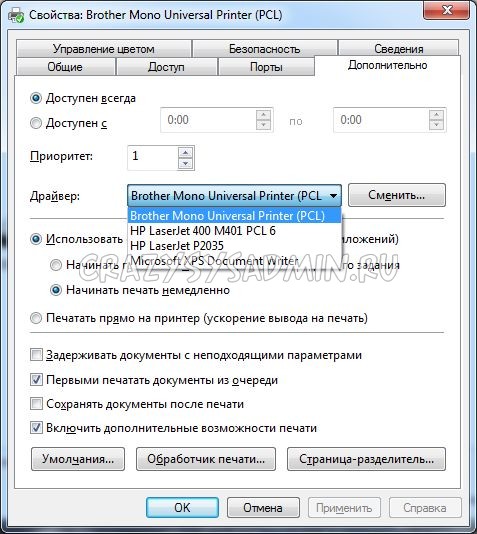 После установки драйвера, необходимо открыть «Устройства и принтеры» на клиентском компьютере, нажать правой кнопкой по проблемному принтеру, и в открывшемся контекстном меню выбрать пункт «Свойства принтера». Там нужно перейти на вкладку «Дополнительно», и в выпадающем меню «Драйвер» выбрать Brother Mono Universal Printer (PCL).
