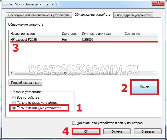 После этого стоит перейти на вкладку «Общие» и нажать кнопку «Настройка». Откроется меню настроек универсального драйвера Brother. В нем следует перейти на вкладку «Обнаружение устройств» и выполнить следующие действия: