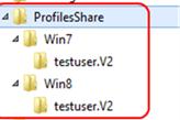 - Удостоверьтесь, что на файловом сервер в соответствующих каталогах создались профили для Windows 7 и 8 (каталог testuser.V2)