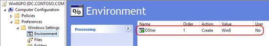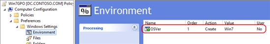 - В каждой из групповых политик с помощью GPP (Group Policy Preferences) создадим собственную переменную среды — OSVerДля Win7GPO: перейдите в раздел Expand Computer Configuration -> Preferences -> Windows Settings -> Environment создадим новую переменную окружения: