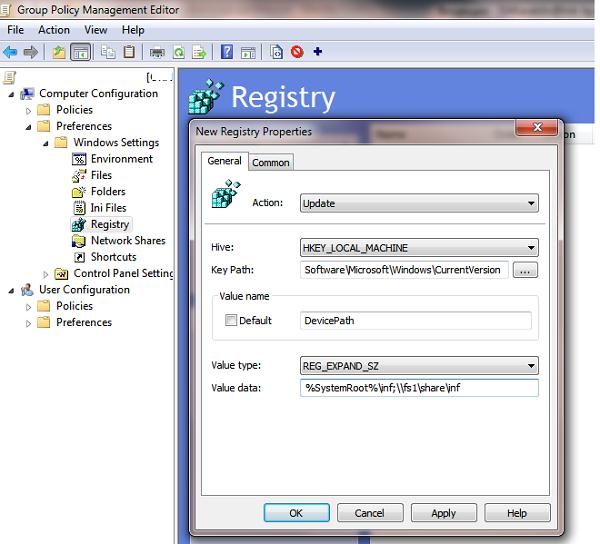 Можно расширить область хранилища драйверов, по которому производится поиск при установке нового драйвера в системе, указав в этом реестра дополнительный каталог. В доменной среде проще всего это сделать с помощью расширения групповых политик — Group Policy Preferences. Для этого в разделе политики Computer Configuration -> Preferences -> Registry добавить новый элемент Registry Item с параметрами: