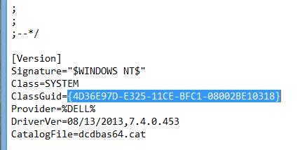 Чтобы определить код класса устройства, откройте каталог с файлами драйвером устройства. Откройте его inf файл и найдите строку с параметром ClassGUID. Код класса устройства в нашем примере выглядит так: {4D36E97D-E325-11CE-BFC1-08002BE10318}.