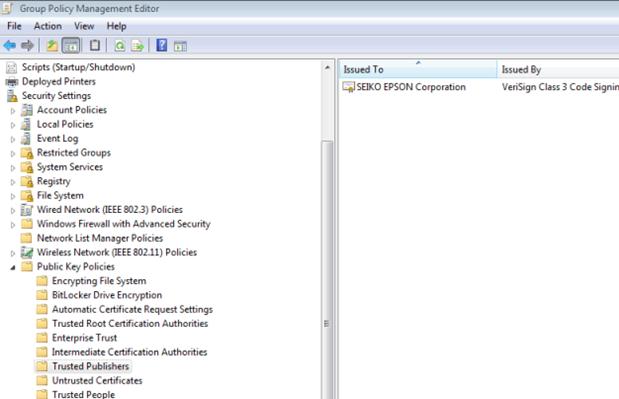 Далее этот сертификат с помощью групповой политики нужно распространить на всех компьютерах, на которых нужно разрешить установку этого драйвера пользователями. Для этого просто импортируйте сохраненный сертификат в раздел GPO Computer Configuration -> Windows Settings -> Security Settings -> Public Key Polices -> Trusted Publishers.