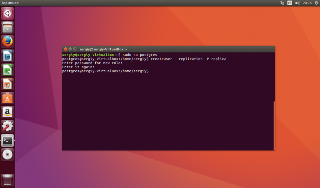 Дальше нам нужно создать нового пользователя, у которого будут права на репликацию. Назовите его replica: