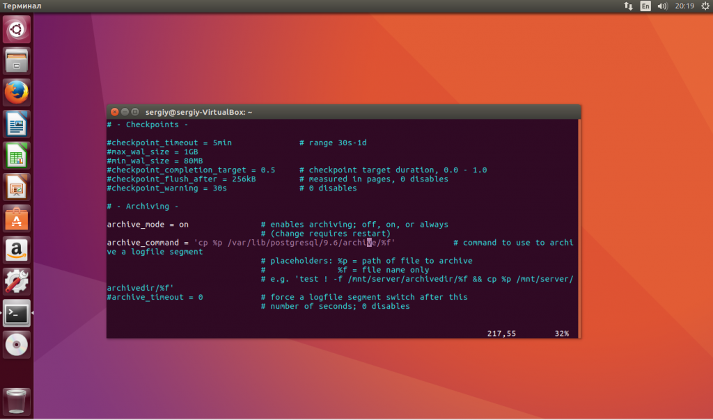 Теперь конфигурационный файл можно закрыть. Поскольку мы включили режим архивирования, нужно создать папку для архивов и отдать ее пользователю postgres: