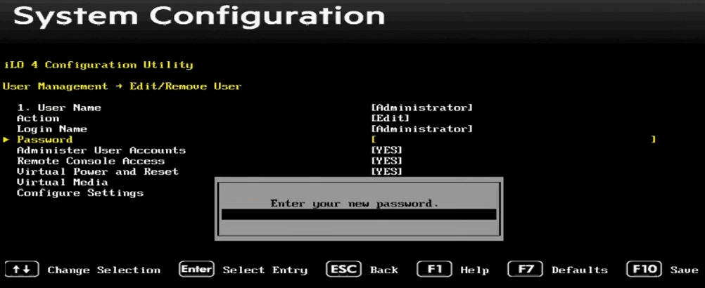 Сохраните изменения, нажав F10. Пароль администратора iLO изменен. Можете продолжить нормальную загрузку сервера.
