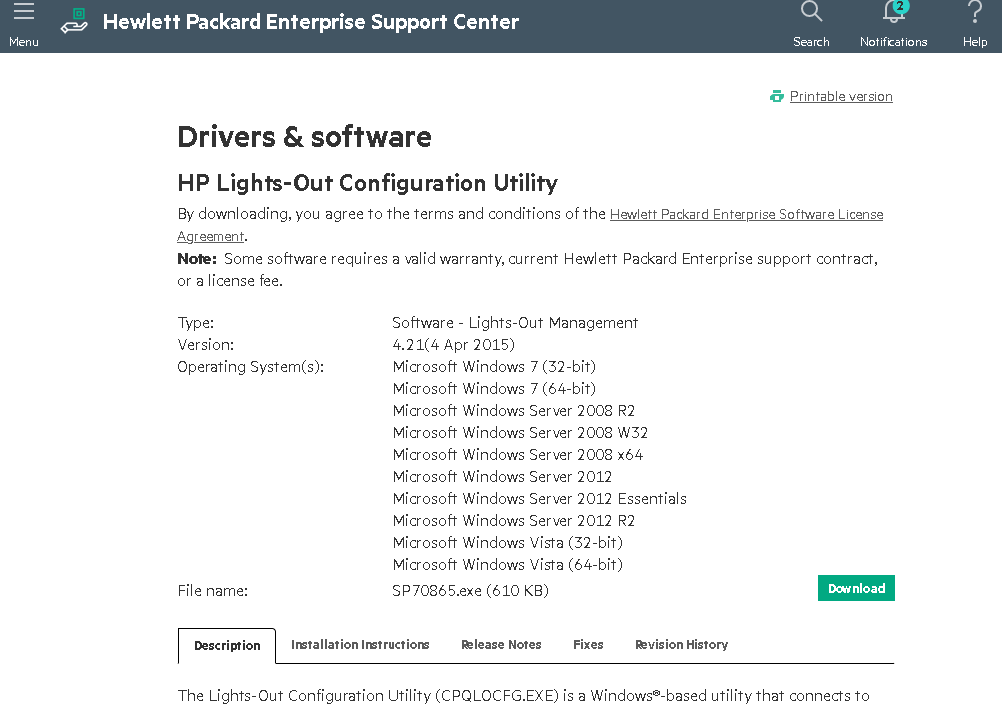 Чтобы сбросить пароль администратора iLO из Windows, нужно скачать и установить пакет HP Lights-Out Configuration Utility SP70865.exe (если он еще не установлен) для вашей версии Windows.