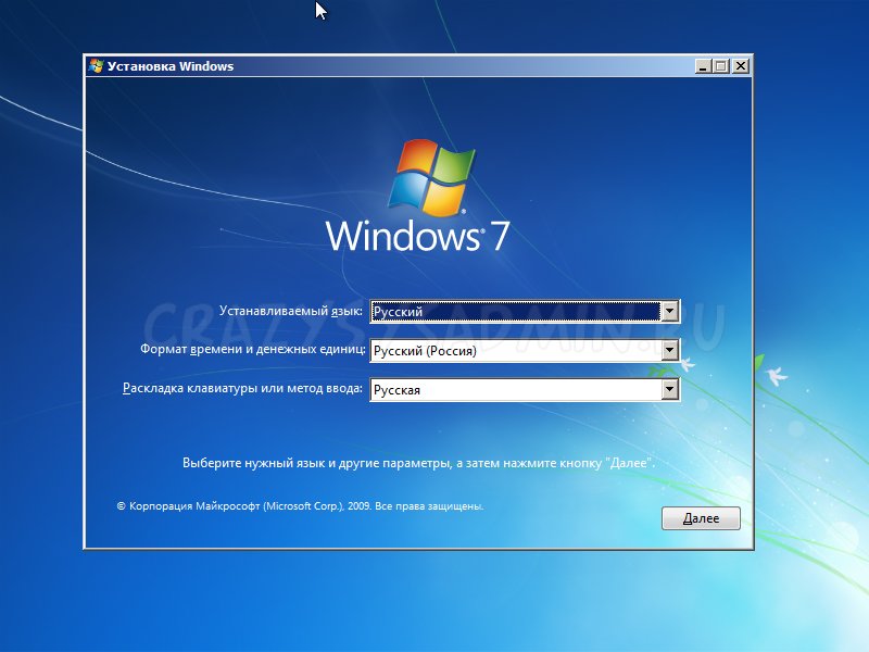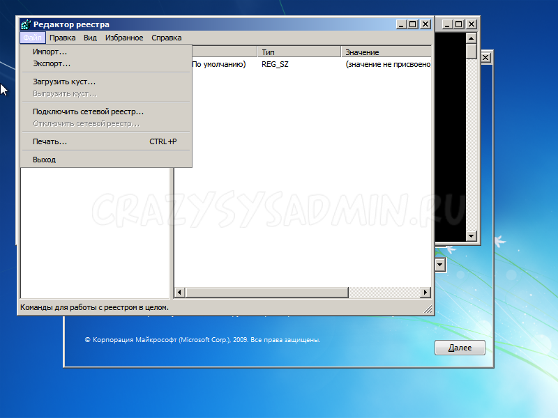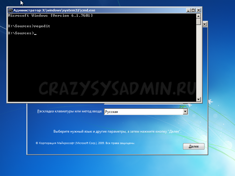 Загружаемся с установочного диска Windows. Ждем загрузки, после чего прямо в первом же меню с выбором нужного языка нажимаем кнопки Shift + F10. Запустится командная строка, в которой вводим команду regedit.