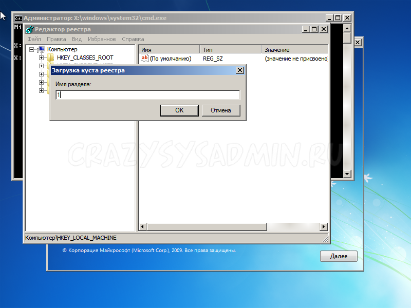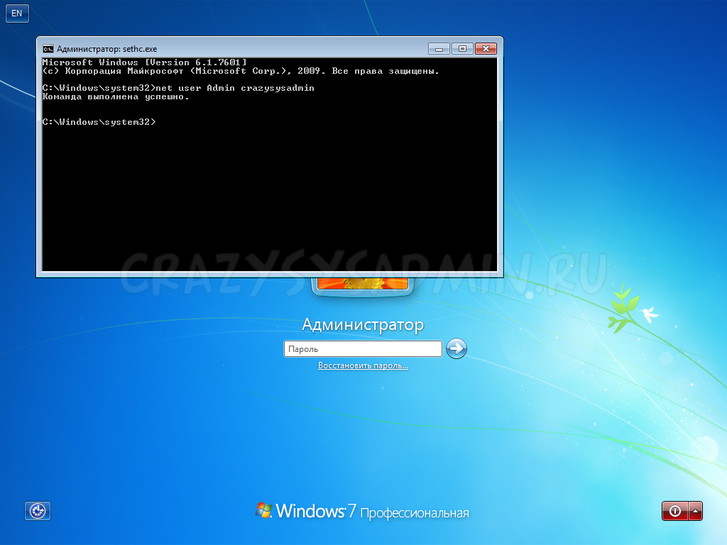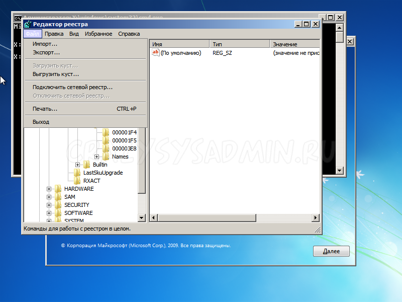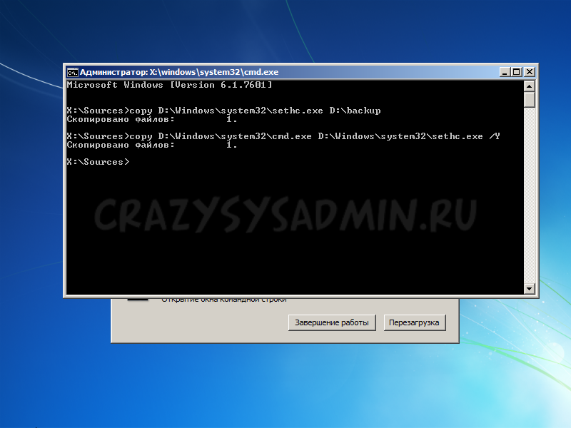 После загрузки системы нажимаем пять раз кнопку Shift, после чего должна запуститься командная строка. Если этого не произошло, скорее всего вы что-то сделали не так из предыдущей части инструкции.