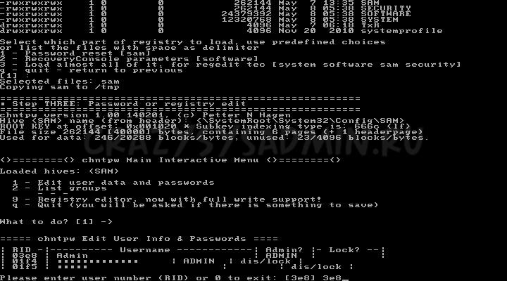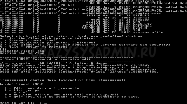 В следующем меню нам будет предложено провести различные манипуляции с пользователем, но нас интересует только пункт 1 — удаление пароля пользователя. Нажимаем 1, затем Enter.