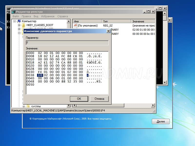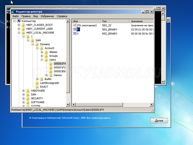Теперь открываем раздел HKEY_LOCAL_MACHINEимя под которым вы сохранили кустSAMDomainsAccountUsers00001F4.