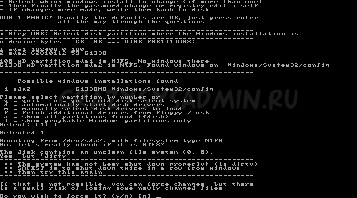 В нем говорится, что компьютер был выключен некорректно, и возможно при продолжении, некоторые последние изменения в системе будут потеряны, и крайне рекомендуется перезагрузить компьютер, подождать пока Windows сделает проверку диска, после чего перезагрузиться опять в Offline NT Password and Registry. Если вы ыне хотите рисковать, нажмите n и Enter. После этого программа сообщит вам, что можно повторить все по новой, но так как нам нужно перезагрузить компьютер, то просто жмем опять n, и потом Enter. Теперь перезагружаем свой компьютер, и выполняем проверку диска.