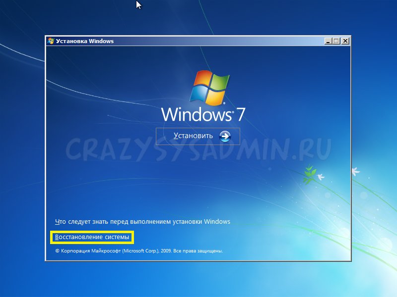 Далее в меню установщика выбираем пункт «Восстановление системы» (расположен в самом низу меню).
