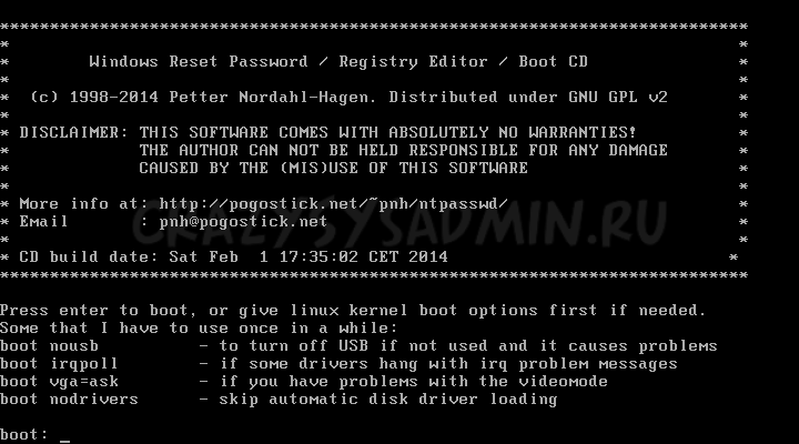 Идем на официальный сайт программы — http://pogostick.net/~pnh/ntpasswd/, и в секции Download скачиваем образ для записи на диск или файлы для USB накопителя (флешка, внешний жесткий диск).