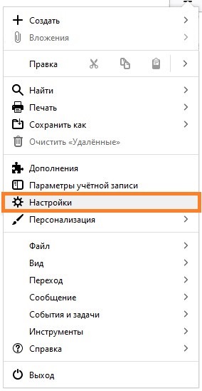 1. В программе Thunderbird открываем меню настроек — для этого нажимаем на кнопку с тремя горизонтальными полосками , и в появившемся меню выбираем пункт «Настройки».