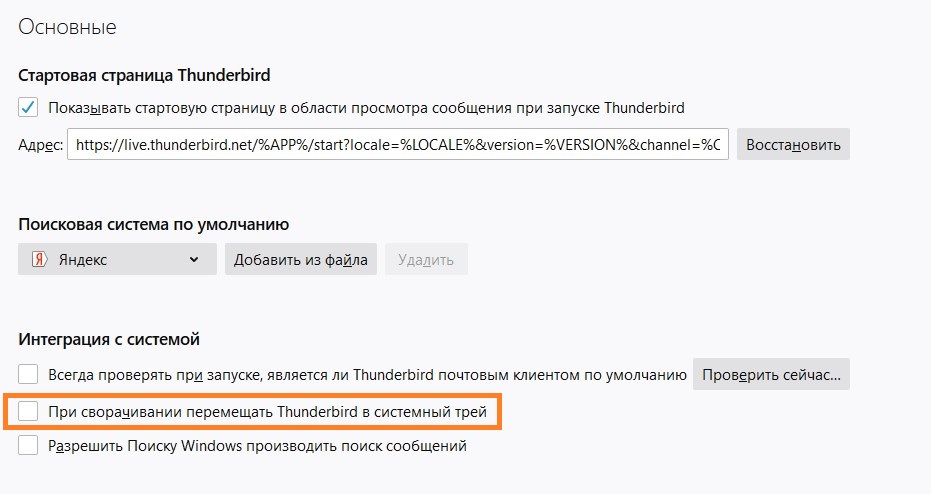 2. В окне настроек, в самом первом разделе «Основное», ищем «Интеграция с системой», и устанавливаем галочку у пункта «При сворачивании перемещать Thunderbird в системный трей».