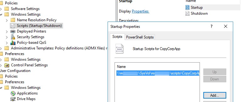 3. Перейдите в раздел Computer Configuration->Policies->Windows Settings->Scripts (Startup/shutdown). Выберите Startup;