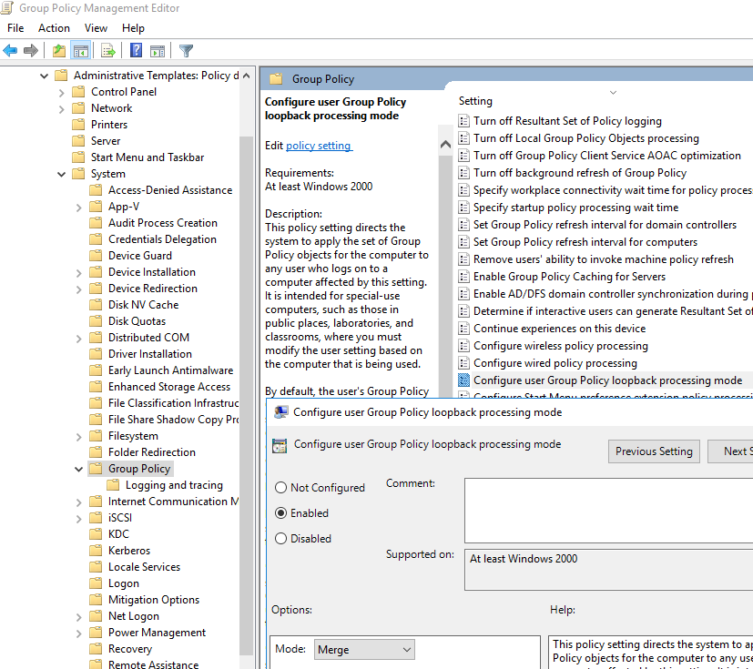 12. Т.к. мы назначили GPO на Organizational Unit с компьютерами (а не пользователями), нужно включить опцию замыкания GPO. В Configure user Group Policy loopback processing mode = Merge в Computer Configuration -> Policies -> Administrative Templates -> System -> Group Policy;