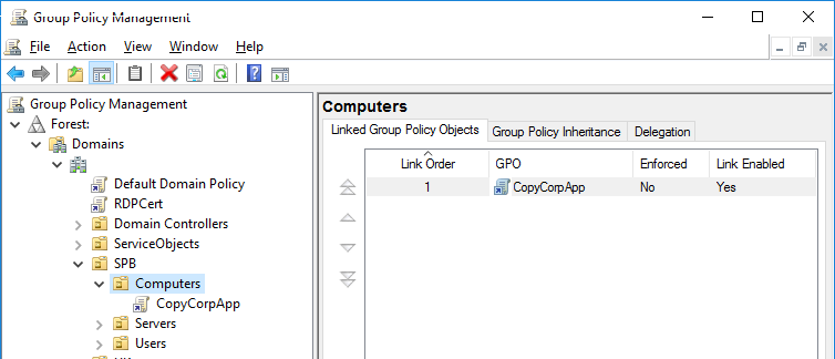 3. Создайте новый объект GPO (CopyCorpApp) и назначьте его на OU, в котором находятся компьютеры пользователей;