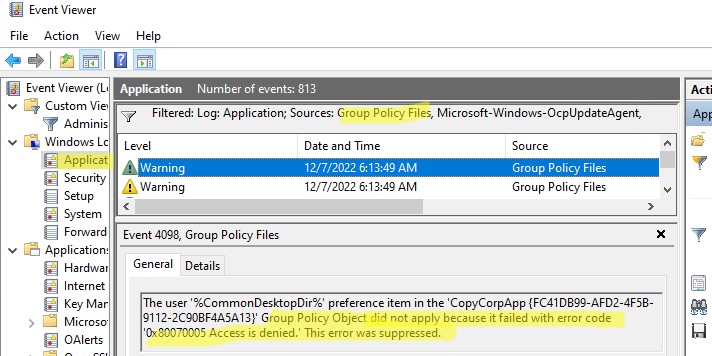 The user '%CommonDesktopDir%' preference item in the 'CopyCorpApp {FC41DB99-AFD2-4F5B-9112-2C90BF4A5A13}' Group Policy Object did not apply because it failed with error code '0x80070005 Access is denied.' This error was suppressed.