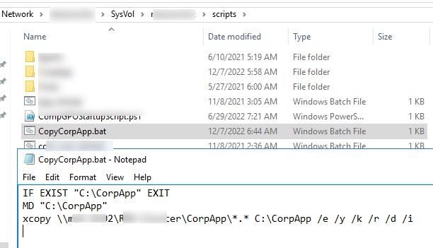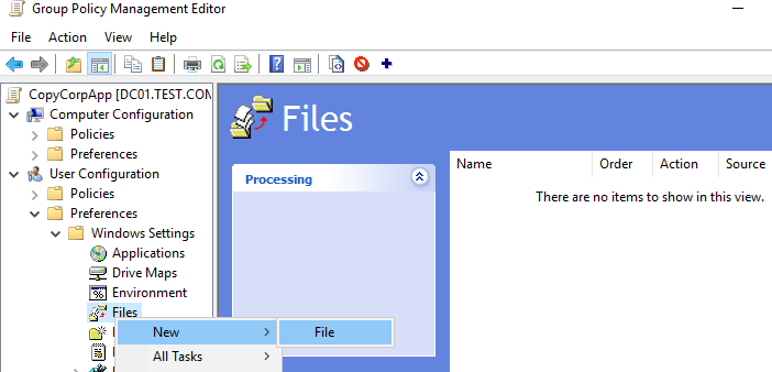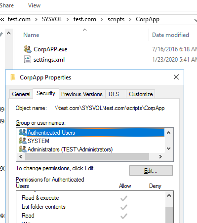 Создайте каталог, в котором будут хранится исходные файлы, которые нужно скопировать на компьютеры пользователей. Это может быть, как общая SMB папка на файловом сервере, так и каталог SYSVOL на контроллере домена (каталог автоматически реплицируется между всеми DC в домене с помощью DFS, его удобно использовать с точки зрения уменьшения нагрузки на WAN каналы). Я поместил файлы в каталог \test.comSYSVOLtest.comscriptsCorpApp .Убедитесь, что у группы Authenticated Users есть права на чтение в этой папке.