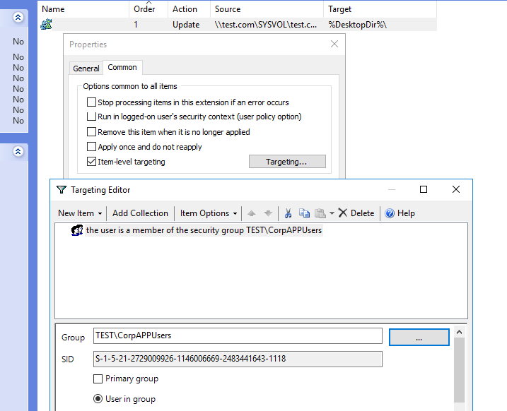 10. Чтобы скопировать файлы на рабочий стол только определенных пользователей, нужно в настройках политики перейти на вкладку Common, включить Item-Level Targeting и нажать кнопку Targetng;