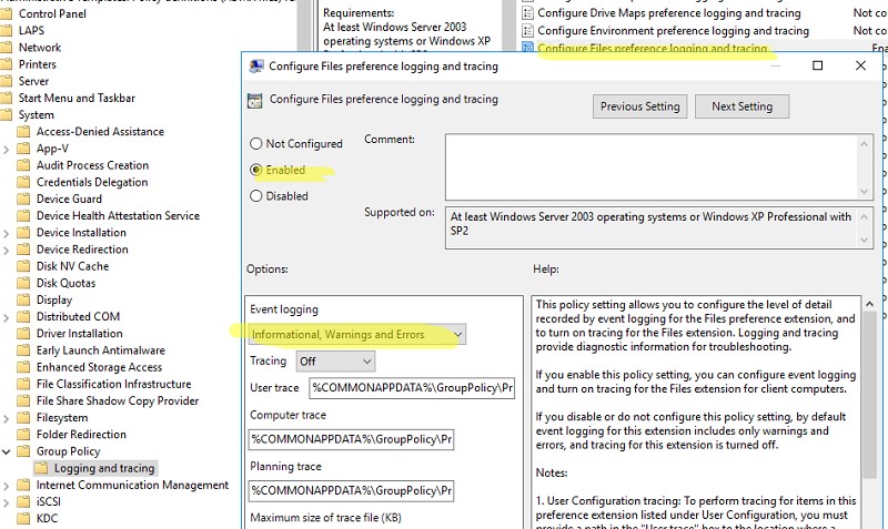 Если после настройки политик файлы, вы можете разобраться почему не применяется групповая политика с помощью утилиты gpresult.exe. Также для получения детальных логов копирования файлов через GPO, вы можете включить лог в разделе Computer Configuration -> Policies -> Administrative Templates -> System -> Group Policy -> Logging and tracing. Включите параметр Configure Files preferences logging and tracing и выберите в настройках режим Informational, Warning, and Errors.