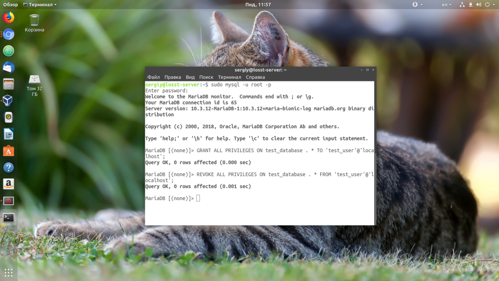 Например, заберём все права на базу данных test_database у нашего пользователя: