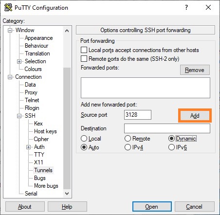 - Нажимаем кнопку «Add«. В строке «Forwarded ports» появится строка D3128, или с любым другим значением, которое было установлено в качестве Source port.