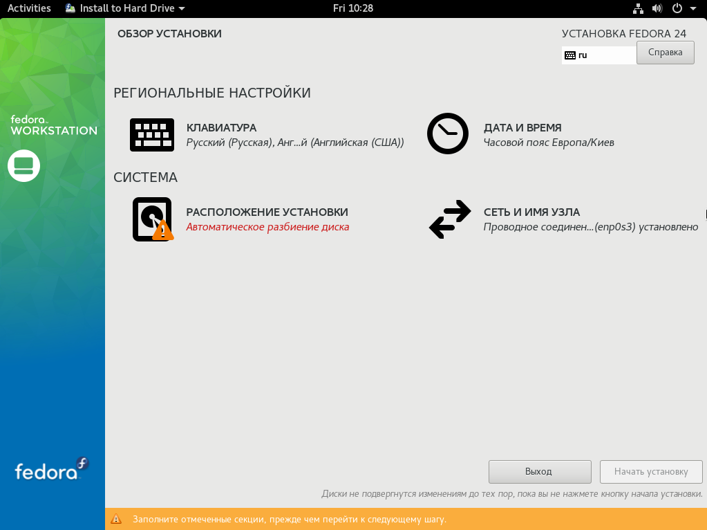 Fedora имеет установщик, совсем непохожий на Debian. Здесь вместо пошагового мастера есть главное меню, через которое вам и предстоит выполнять настойки различных параметров. Здесь нет такого большого количества опций, как в Debian, но вы по-прежнему можете выбрать программное обеспечение, которое будет установлено.