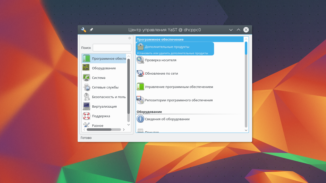 В OpenSUSE есть менеджер конфигурации YaST, с помощью которого можно настроить практически все в системе, начиная от поведения сервисов до пользователей и репозиториев. Также с помощью этой же программы можно просматривать логи, управлять диском и устанавливать программное обеспечение.