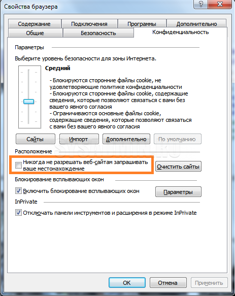 Переходим на вкладку «Конфиденциальность», и в разделе «Расположение» ставим галочку у пункта «Никогда не разрешать веб-сайтам запрашивать ваше местонахождение».