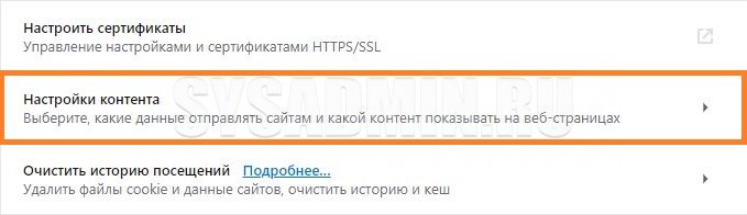 - В раскрывшемся списке дополнительных настроек нужно открыть пункт «Настройки контента«.