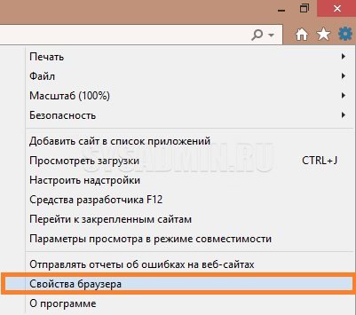 В Internet Explorer выключить запросы о местоположении можно через настройки. Открываются они по нажатию на значок шестеренки в верхнем правом углу, и выборе пункта меню «Свойства браузера«.