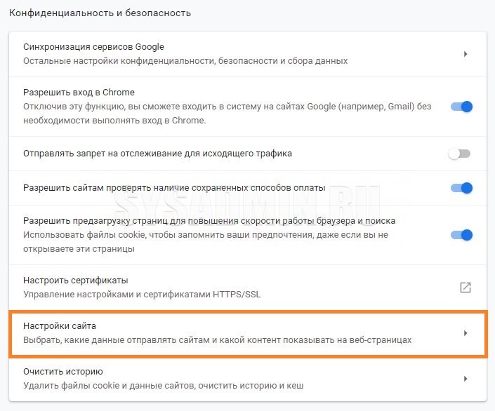 - После этого, ниже появится блок настроек под названием «Конфиденциальность и безопасность«. В нем присутствует пункт «Настройки сайта«, который то нам и нужен. Нажимаем на него.