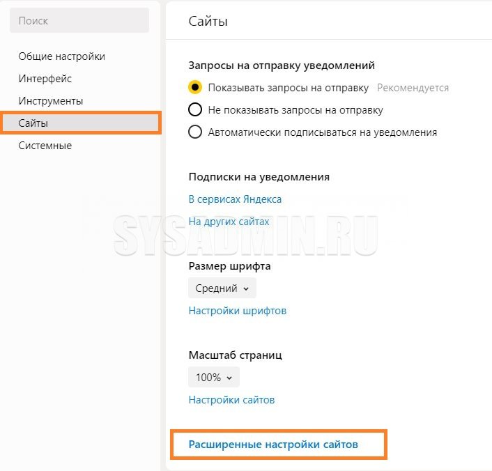- В настройках нужно перейти к пункту «Сайты», и нажать на «Расширенные настройки сайтов«.