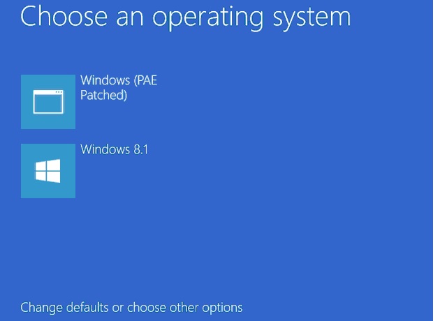 bcdedit /set {bootmgr} timeout 10Совет. Последние две команды выполняются по желанию - Осталось перезагрузить компьютер и, если вы все сделали правильно, появится такой экран. Выберем вариант Windows (PAE Patched), после чего 32-битная версия Windows 8 или 8.1 должна загрузиться в режиме, поддерживающем более 4 Гб оперативной памяти.