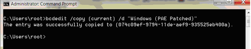 bcdedit /copy {current} /d "Windows (PAE Patched)" - Далее необходимо скопировать полученный уникальный {boot ID} — {074c09ef-9794-11de-aef9-935525eb400a} (в вашем случае он будет отличаться) и последовательно выполнить следующие команды (в качестве boot ID необходимо использовать полученный вами идентификатор):