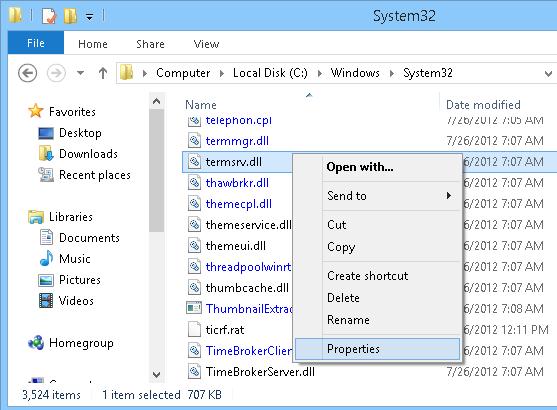 Затем переходим в каталог C:WindowsSystem32, находим файл termsrv.dll и открываем его свойства.
