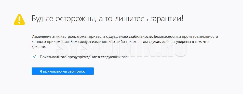 about:configи нажимаем Enter. - Появится полушутливое предупреждение о лишении гарантии. Нажимаем кнопку «Я принимаю на себя риск!«.
