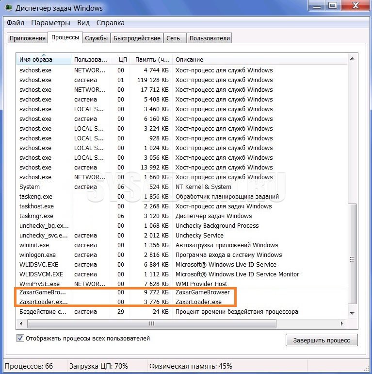 - Начинаем ручную чистку системы от данной программы. Открываем Диспетчер Задач, и завершаем процессы ZaxarGameBrowser и ZaxarLoader.
