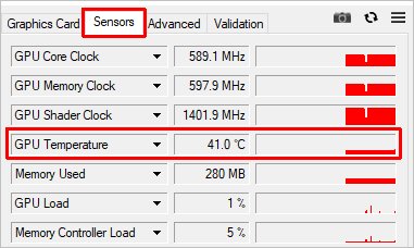 После запуска, переходим на вкладку Sensors и в разделе GPU Temperature мы увидим информацию о текущей температуре: