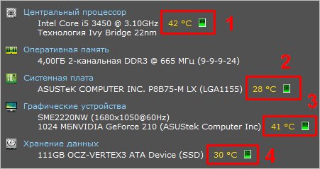 Узнать температуру процессора, видеокарты и дискового носителя