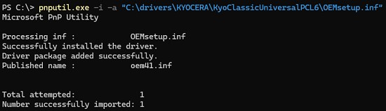 pnputil.exe -i -a "C:driversKYOCERAKyoClassicUniversalPCL6OEMsetup.inf"