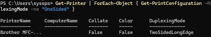 Get-Printer | ForEach-Object { Get-PrintConfiguration -PrinterName $_.Name } | Where-Object { $_.DuplexingMode -ne "OneSided" }