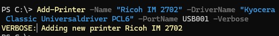 Add-Printer -Name "Ricoh IM 2702" -DriverName "Kyocera Classic Universaldriver PCL6" -PortName USB001 -Verbose