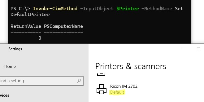 Invoke-CimMethod -InputObject $Printer -MethodName SetDefaultPrinter
